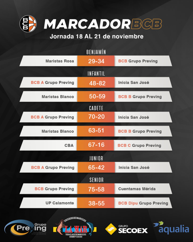 Portada 21/11/2022 Resultados de la jornada 18-20 de noviembre Estos fueron los resultados de nuestra cantera BCB Grupo Preving este fin de semana: